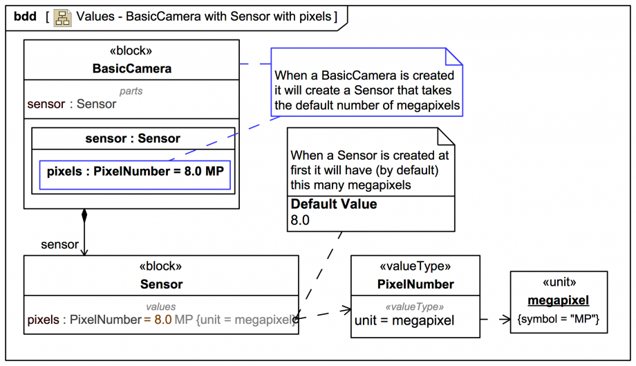 A block Sensor has a value property pixels of ValueType PixelNumber and a Unit megapixel with symbol 'MP'. The value property pixels has a default value of 8.0 MP assigned. A block BasicCamera that has a part sensor:Sensor just accepts that default.