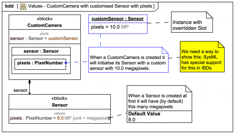 When an instance of CustomCamera is created it will have a Slot for the part property sensor populated by the customSensor instance with 10.0 MP. We need a way to show this value override; SysML has special support for this in IBDs.