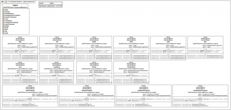 The following diagram shows a Block Definition Diagram (BDD) representation of MagicDraw/Cameo SysPhSLibrary components vs the SysPhS-1.1 spec table 11.3.3 Logical components: