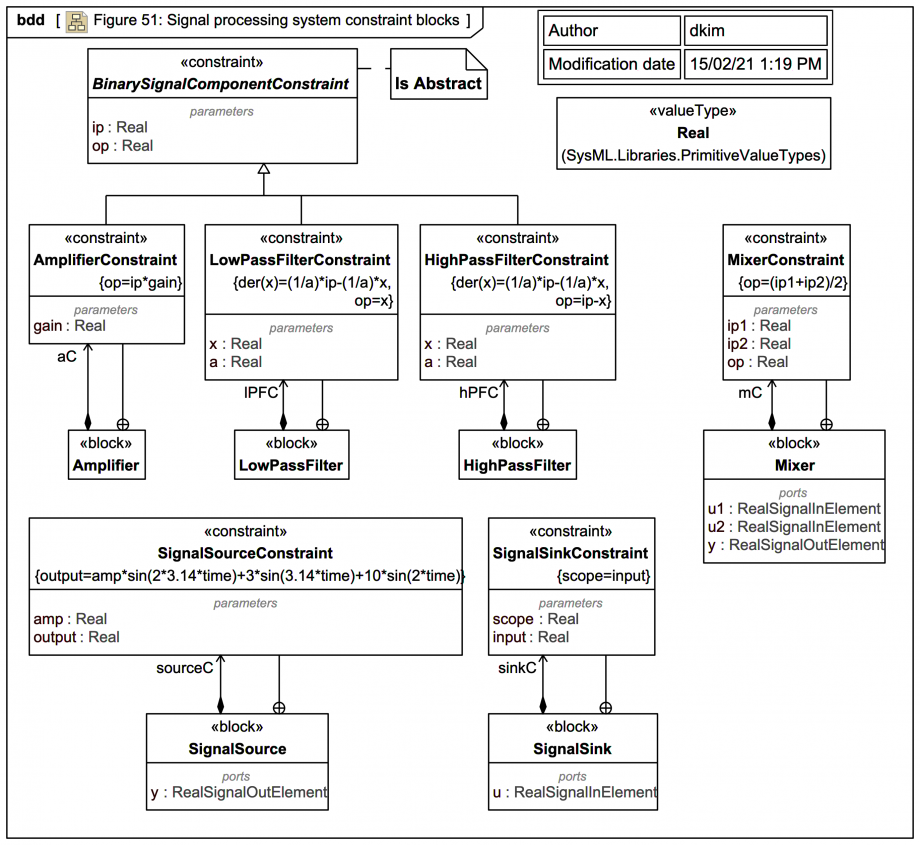 SysPhS-1.1: 'Equations define mathematical relationships between the values of numeric variables. Equations in SysML, are constraints in constraint blocks that use properties of the blocks (parameters) as variables. In this example, a constraint block BinarySignalComponentConstraint defines the parameters for one input (ip) and one output (op), common to amplifiers, low-pass filters, and high-pass filters, as shown in Figure 51. The amplifier, low-pass fil[t]er, and high-pass filter constraints show the input-output relationship of these components as the signal passes through them. The amplifier changes the signal strength by a factor gain, the low-pass filter eliminates the high-frequency components of the incoming signal, and the high-pass filter eliminates the low-frequency components of the signal. The mixer constraint specifies the relationship between its one output and the two inputs that come from the low-pass and high-pass filters. The constraint defines the output to be the average of the inputs. The source constraint specifies a sine wave signal with the parameter amp as its amplitude. The sink constraint displays (scopes) the output signal from the signal processor.'