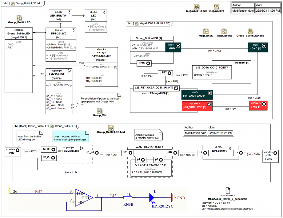pin of the ATmega2560 mcu chip are connected to the «net» PB7 which is also connected to a Port of the block Group_BuiltinLED with its opamp and protecting resistor (via a resistor array).