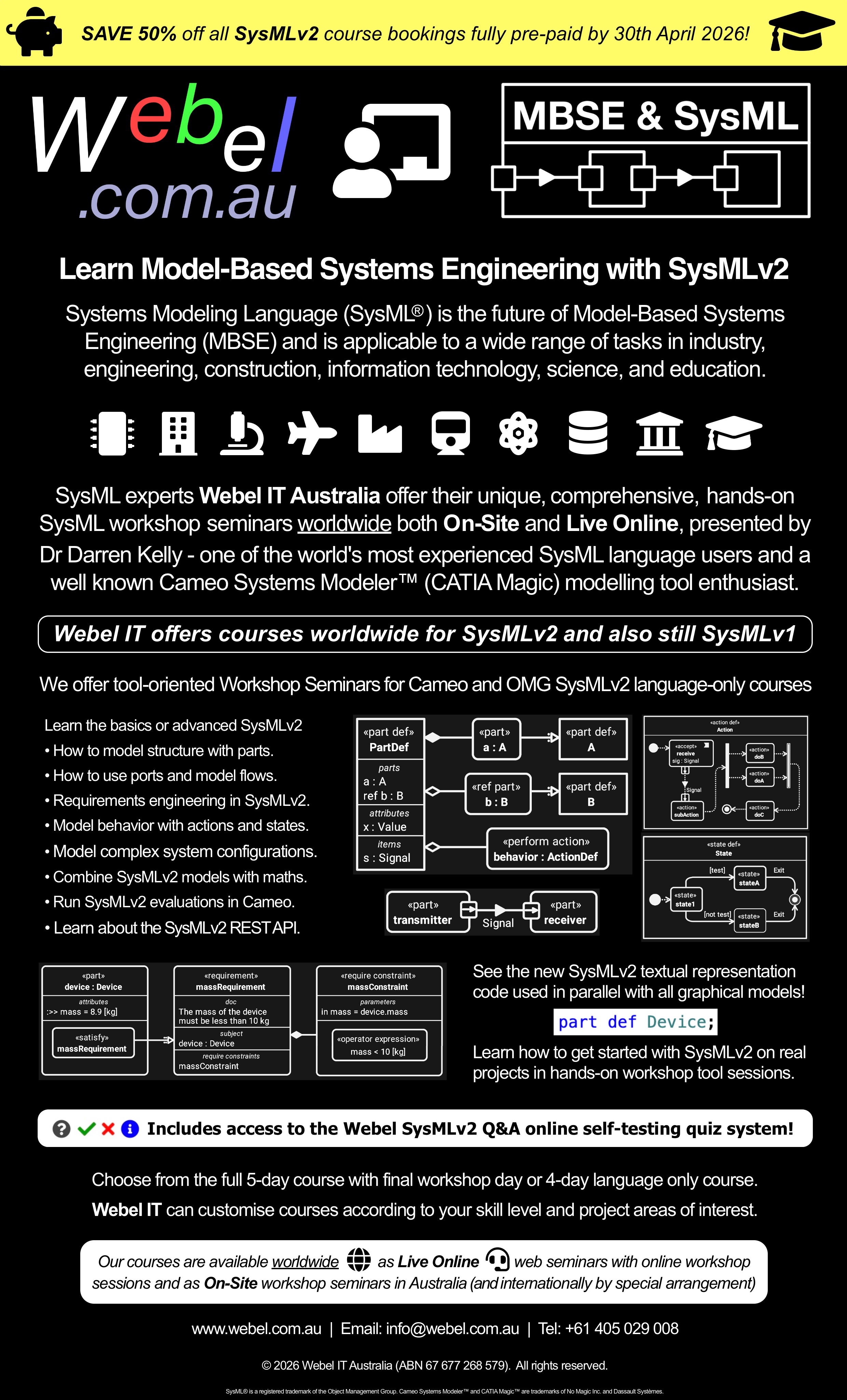 Learn SysML for MBSE with a Webel IT Australia Live Online web seminar or On-Site course!