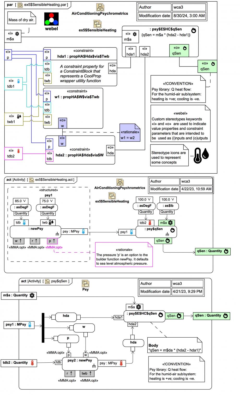 At the top we see a SysML Parametric Diagram representing a network of equations for the psychrometric properties obtained from low-level CoolProp wrappers for Mathematica, and a Psy library function for calculating the sensible heat in the case where there is no exchange of water. Note how the humidity ratio 'w' for calculation of 'hda2' (for State2) is bound to the humidity ratio 'w1' of initial state State1, because the water vapour content does not change.