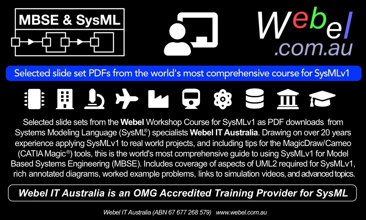 Due to popular request Webel IT Australia is now making downloads of selected slides sets from the main Webel Workshop Seminar for MBSE with SysMLv1 available for purchase as a bundled PDFs download.