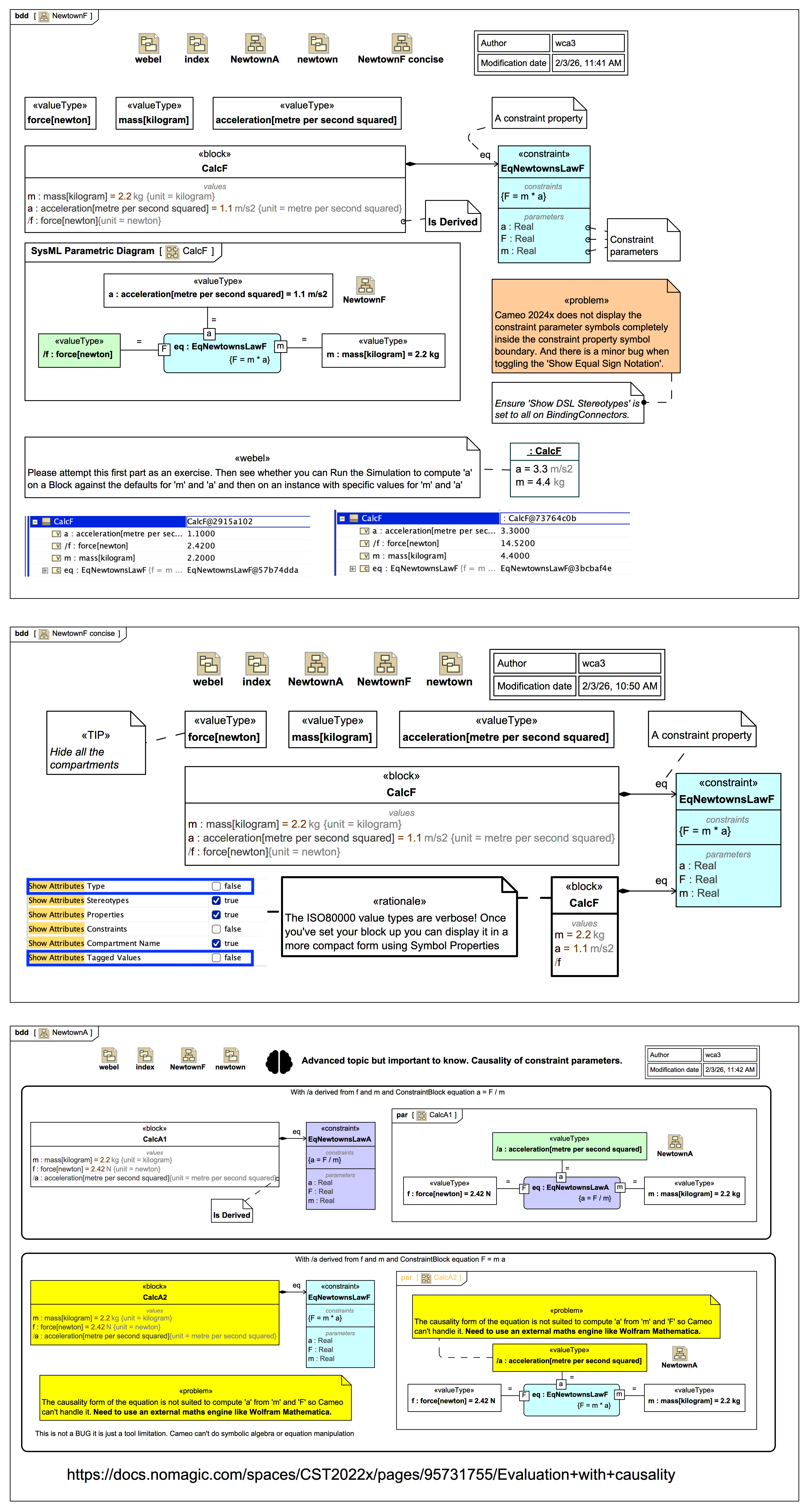 The 1st composite image shows a SysMLv1 BDD and Parametric Diagram for the simplest case F = m * a where 'm' and 'a' are the inputs, provided either as default values on the value properties, or as more specific values on Slots of an instance. In this case, the causality is direct such that Magic Model Analyst® (Cameo Simulation Toolkit®) can use the constraint F = m * a to calculate the derived value /f