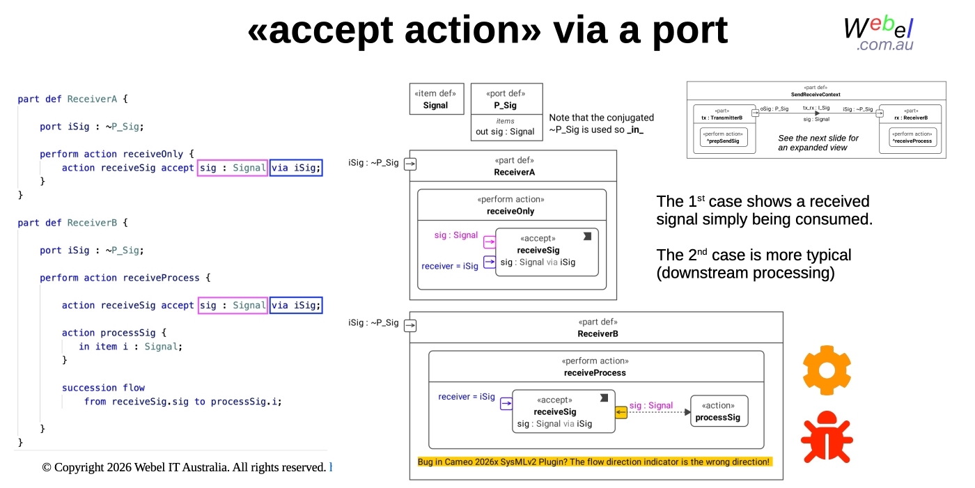 ISSUE: Cameo 2026x: SysMLv2 Plugin: AcceptAction: The flow direction indicator of the received item parameter is BACKWARDS when connected to a downstream consumer!