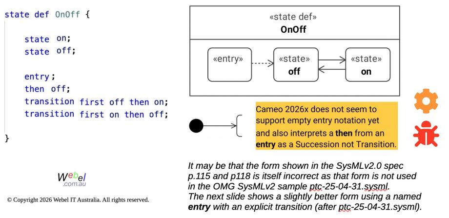 Cameo 2026x SysMLv2 does not seem to support empty entry notation yet and also interprets a then from an entry as a Succession not Transition.